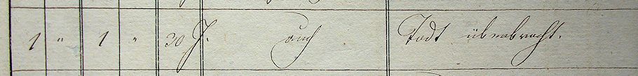 The entry in the records of the cholera hospital on the Strozzigrund concerning the arrival of Kyselak's body: "30 J. auch [Brechdurchfall] Todt überbracht." ("30 years old, diarrhea with vomiting, dead on arrival"). The use of the term "Cholera" was not permitted (to forestall further plagiarism, this source must remain unspecified).